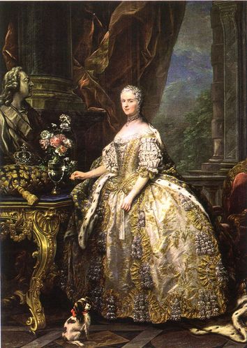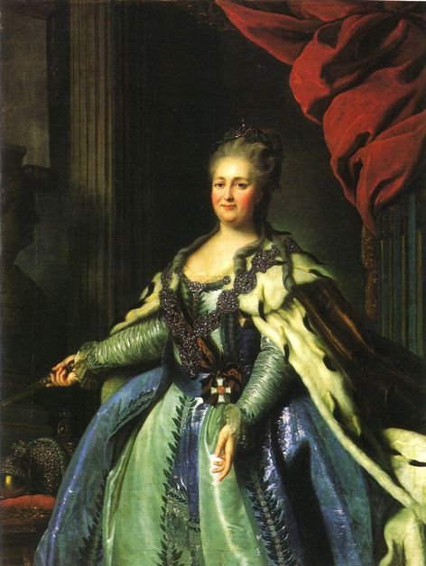 Catherine II, la Grande Catherine, tsarine de Russie, apparaît majestueuse, le sceptre à la main. La pose est tout aussi majestueuse avec un éventail. Le geste est identique.