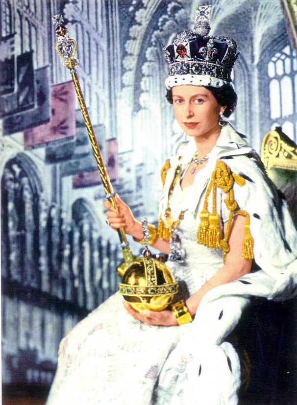 Les reines Victoria et Elizabeth II posent, le sceptre à la main,