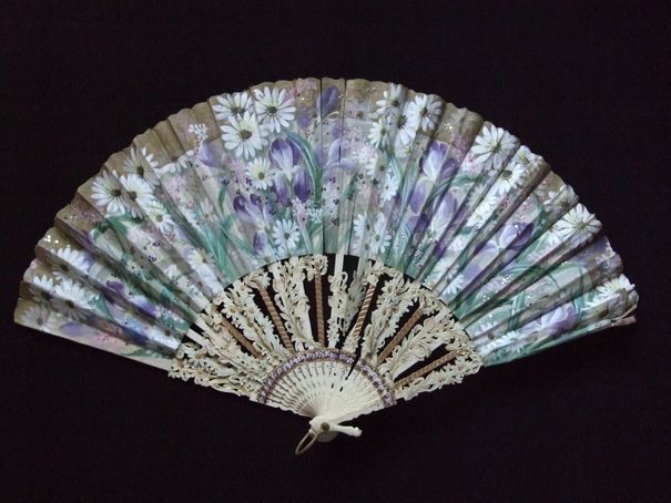 Feuille en soie peinte d'iris et marguerites. Sequins verts et mauves.