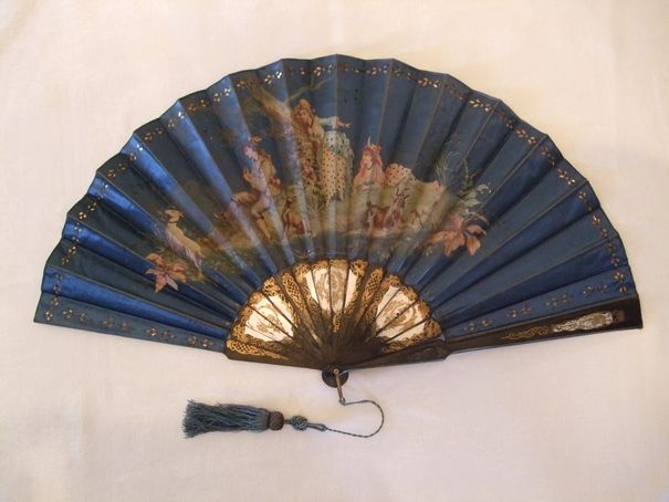 Feuille double en satin bleu nuit à motif imprimé. Signature à gauche: A. Lauronce.
